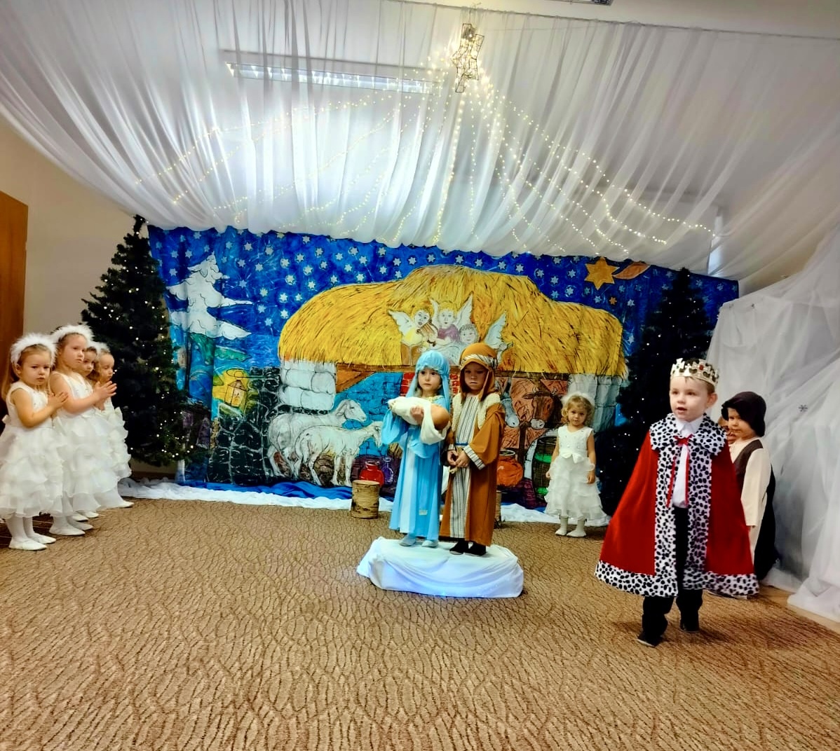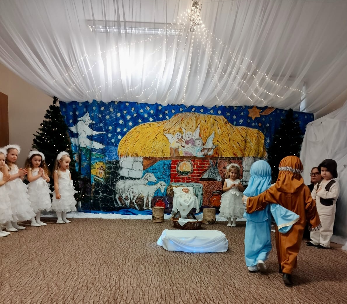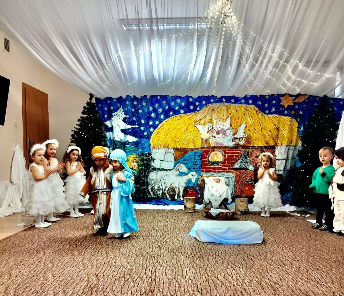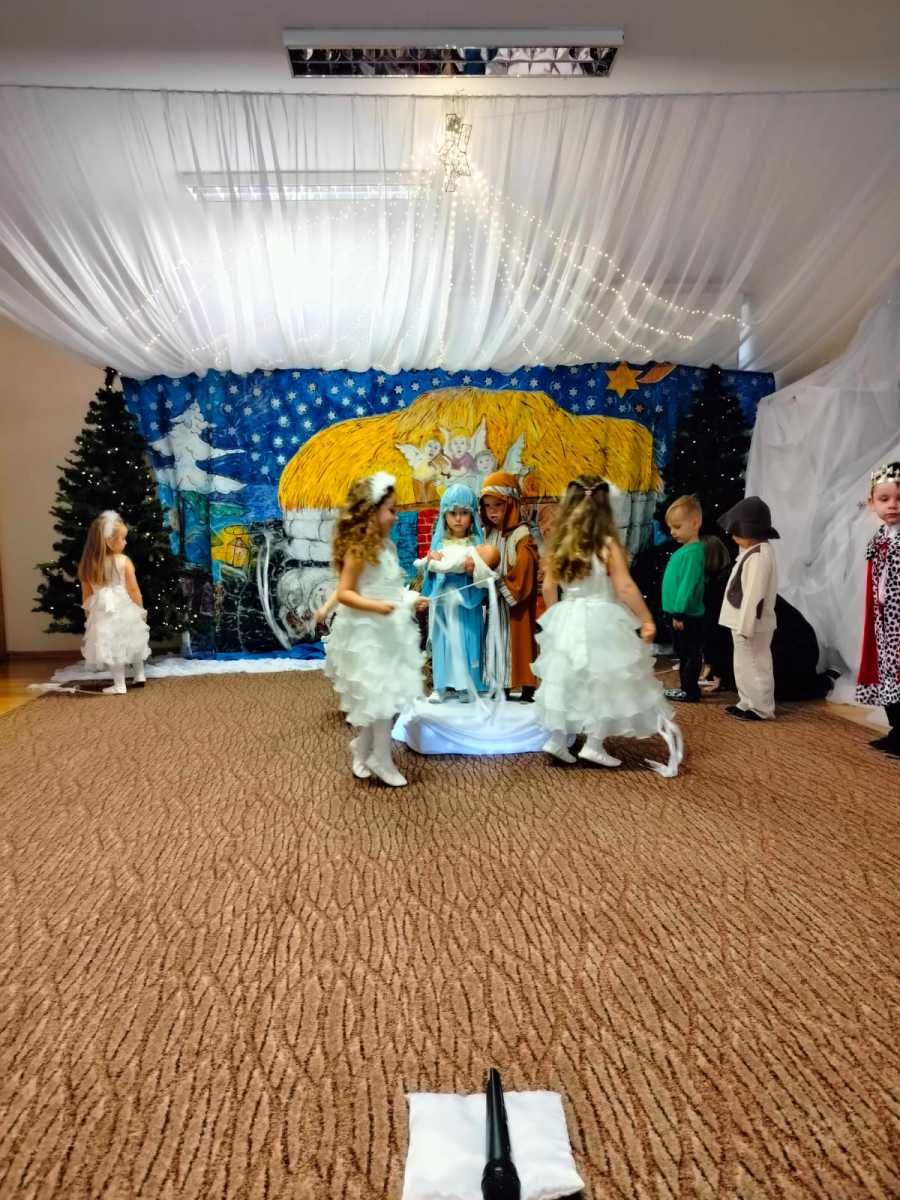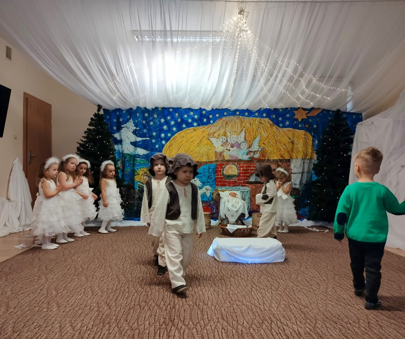 Święto Babci i Dziadzia od wielu lat wpisane jest do terminarza uroczystości organizowanych w naszym przedszkolu. Także w tym roku nasi mali artyści z zaangażowaniem przygotowywali się do nadchodzącego święta. W pięknej scenerii oraz wyjątkowej atmosferze w dniu 26.01.24 r. wnuczęta wystąpiły przed swoimi kochanymi Babciami i Dziadziusiami. Mali artyści recytowali wiersze, aniołki zatańczyły piękny taniec, dzieci zaśpiewały również pastorałkę „Aniołek maleńki jak wróbelek” a na koniec jasełkowego przedstawienia z „przytupem” 🙂 zaśpiewaliśmy „Czaczę dla Babci i Dziadka”.