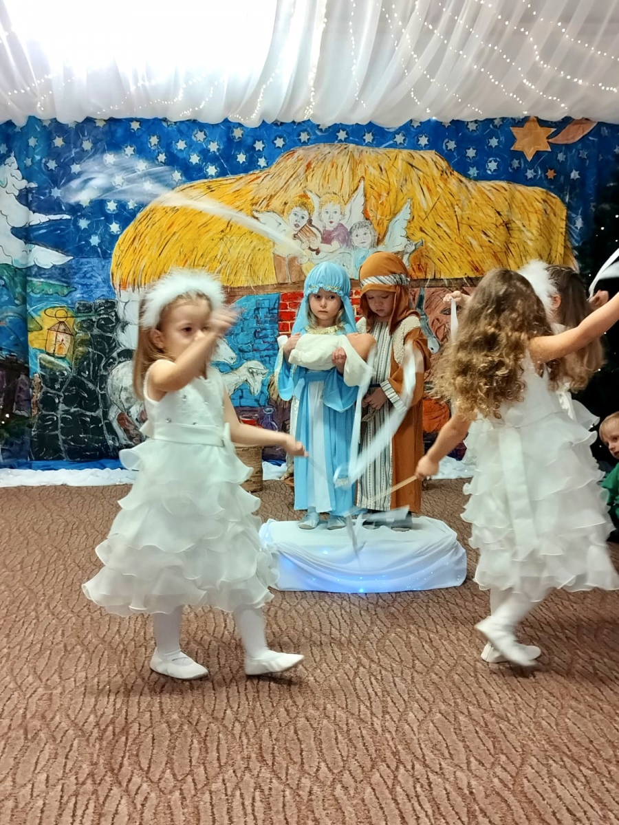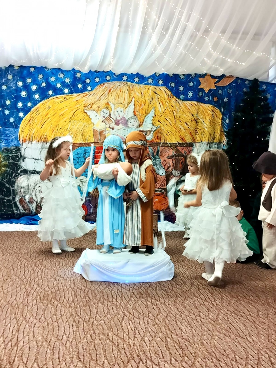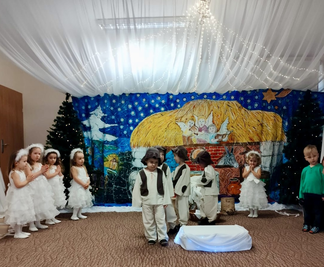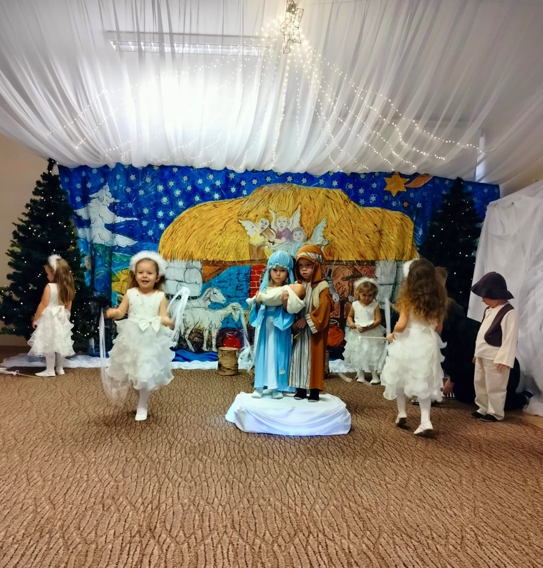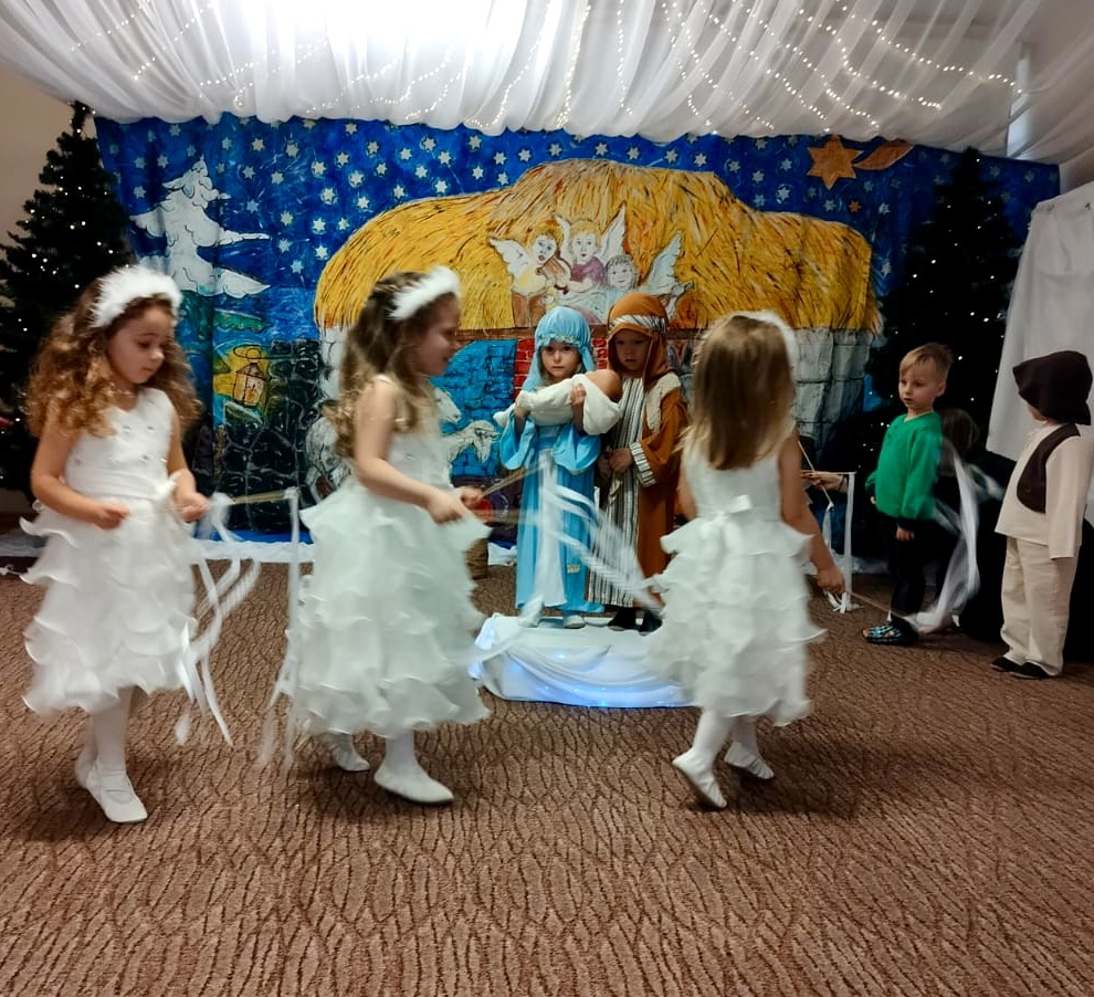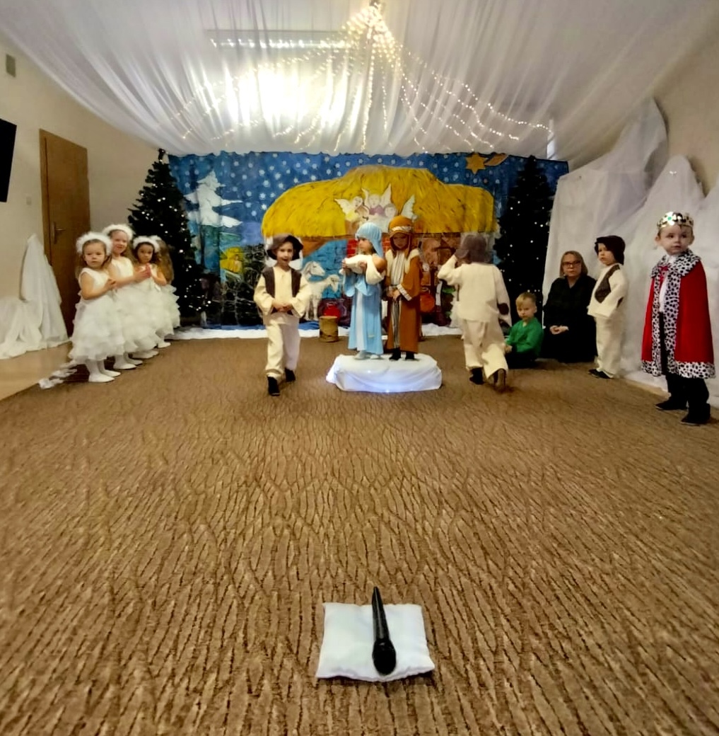Święto Babci i Dziadzia od wielu lat wpisane jest do terminarza uroczystości organizowanych w naszym przedszkolu. Także w tym roku nasi mali artyści z zaangażowaniem przygotowywali się do nadchodzącego święta. W pięknej scenerii oraz wyjątkowej atmosferze w dniu 26.01.24 r. wnuczęta wystąpiły przed swoimi kochanymi Babciami i Dziadziusiami. Mali artyści recytowali wiersze, aniołki zatańczyły piękny taniec, dzieci zaśpiewały również pastorałkę „Aniołek maleńki jak wróbelek” a na koniec jasełkowego przedstawienia z „przytupem” 🙂 zaśpiewaliśmy „Czaczę dla Babci i Dziadka”.