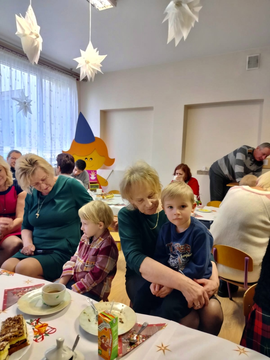 Święto Babci i Dziadzia od wielu lat wpisane jest do terminarza uroczystości organizowanych w naszym przedszkolu. Także w tym roku nasi mali artyści z zaangażowaniem przygotowywali się do nadchodzącego święta. W pięknej scenerii oraz wyjątkowej atmosferze w dniu 26.01.24 r. wnuczęta wystąpiły przed swoimi kochanymi Babciami i Dziadziusiami. Mali artyści recytowali wiersze, aniołki zatańczyły piękny taniec, dzieci zaśpiewały również pastorałkę „Aniołek maleńki jak wróbelek” a na koniec jasełkowego przedstawienia z „przytupem” 🙂 zaśpiewaliśmy „Czaczę dla Babci i Dziadka”.