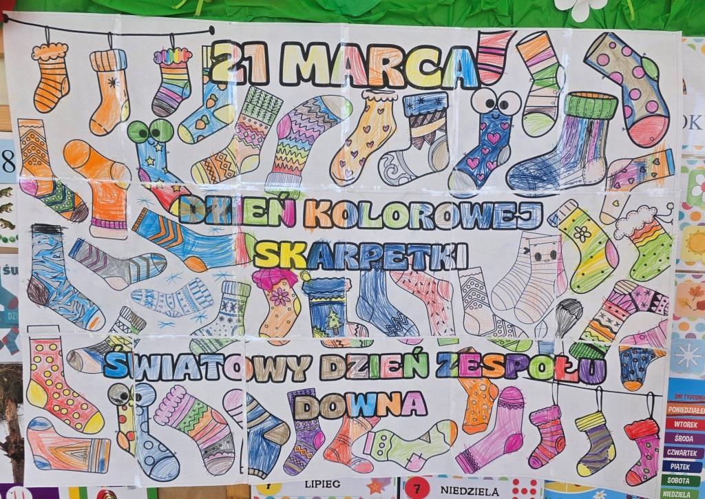 21 marca w pierwszy dzień wiosny dzieci z grupy V pamiętały również o dniu kolorowej skarpetki. W godzinach popołudniowych wysłuchały historii powstania tego święta i tradycji ubierania dwóch różnych skarpetek. Po krótkiej pogadance wykonały wspólny plakat. Dzięki tym działaniom dzieci rozwijają swoje poczucie wrażliwości i tolerancji wobec osób z niepełnosprawnościami, a szczególnie osób z zespołem Downa.