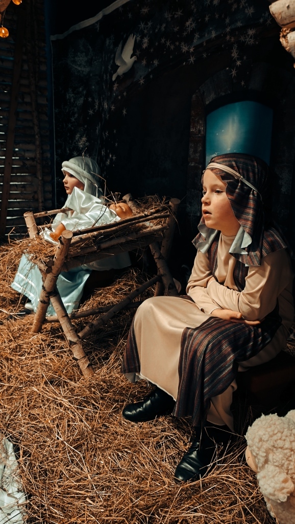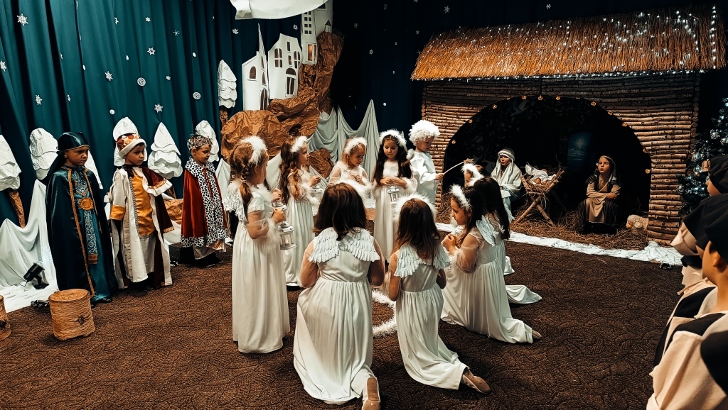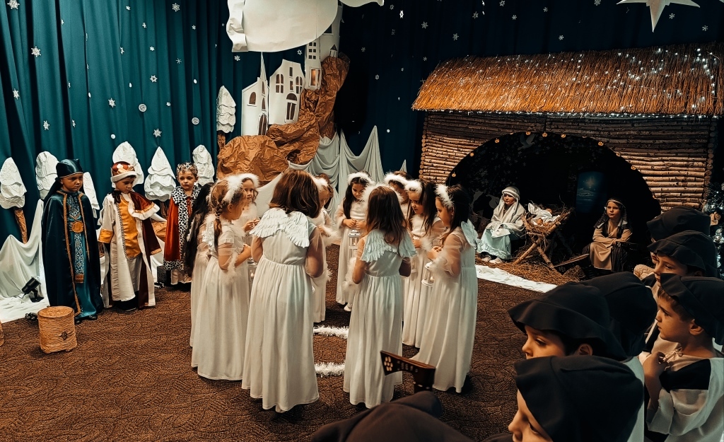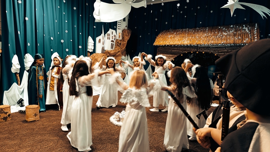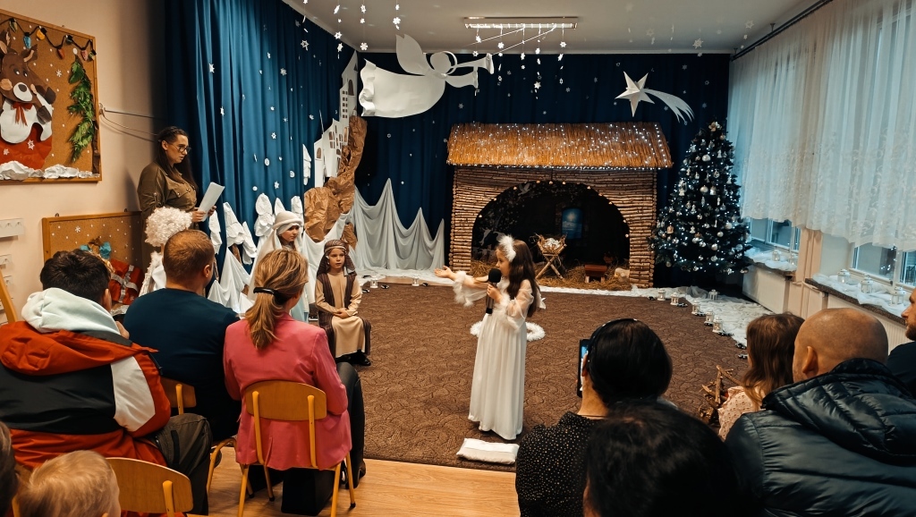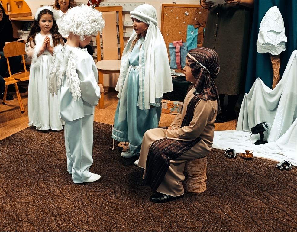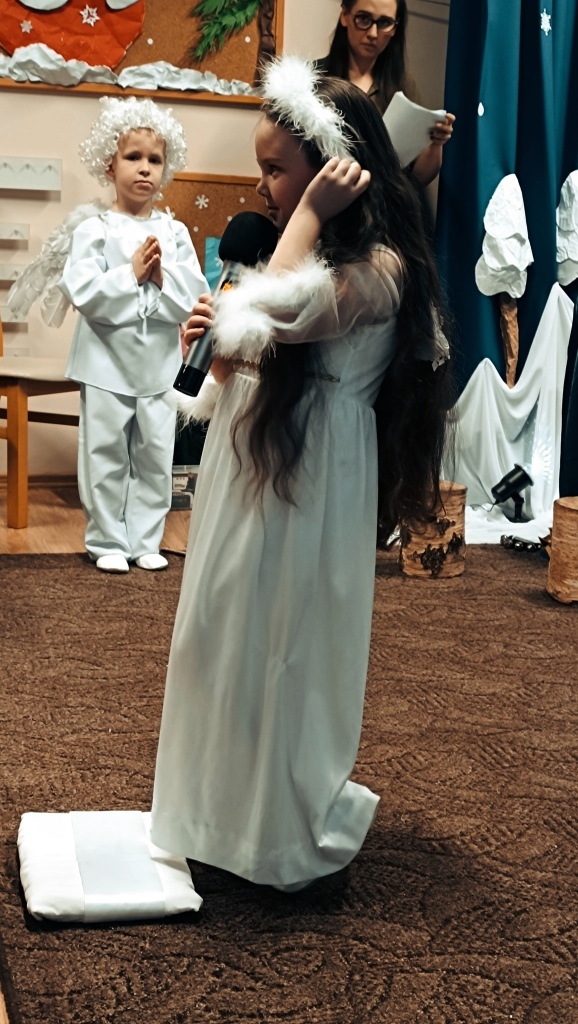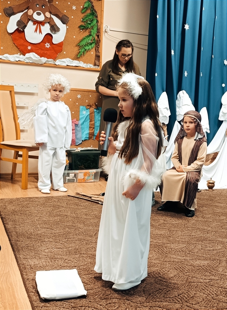 W dniu 14.12.2023r. dzieci z gr.V przedstawiły swoim rodzicom i rodzeństwu historię Narodzenia Jezusa w Betlejem od samego początku, tj.od Zwiastowania Maryi Wesołej Nowiny przez Archanioła Gabriela. Piękny śpiew i taniec aniołków, góralskie wygibasy z ciupagami pastuszków, gra na skrzypcach Archanioła oraz doskonale wyrecytowane wiersze, uświetniły ten wieczór i wprowadziły wszystkich zgromadzonych gości w prawdziwie świąteczny nastrój.