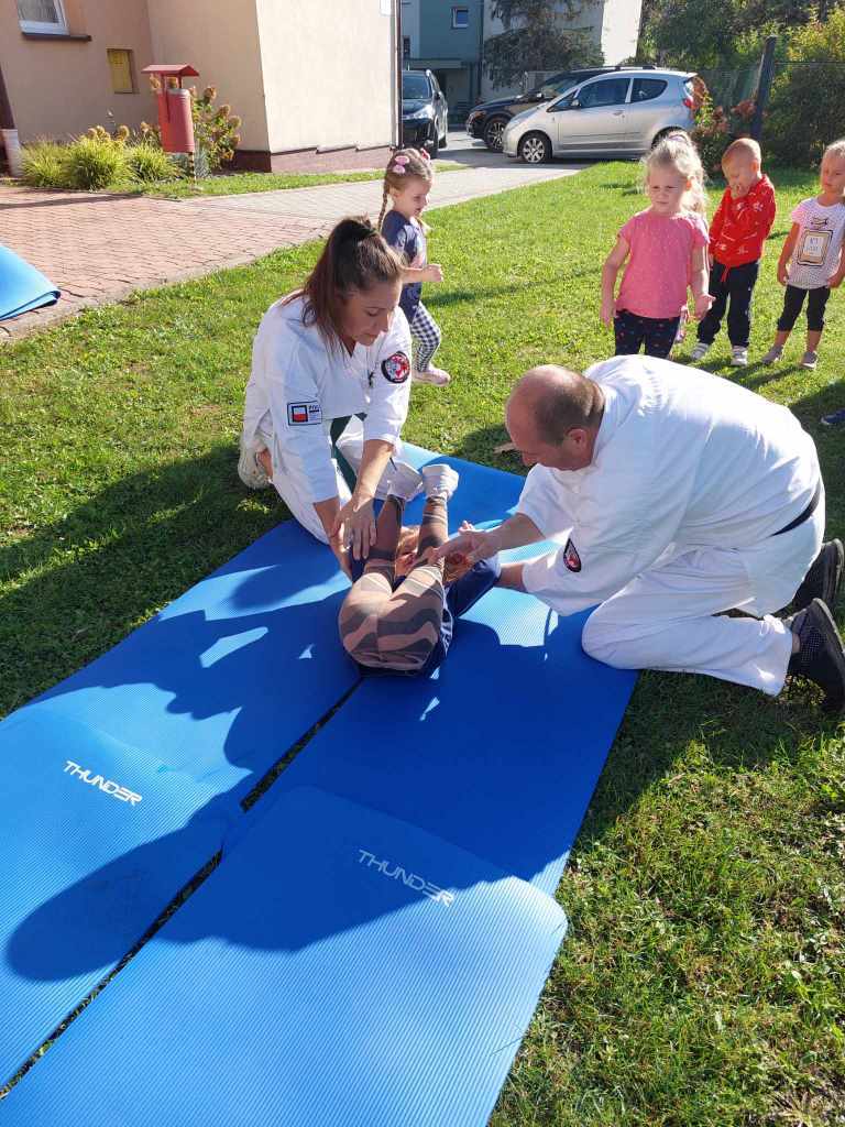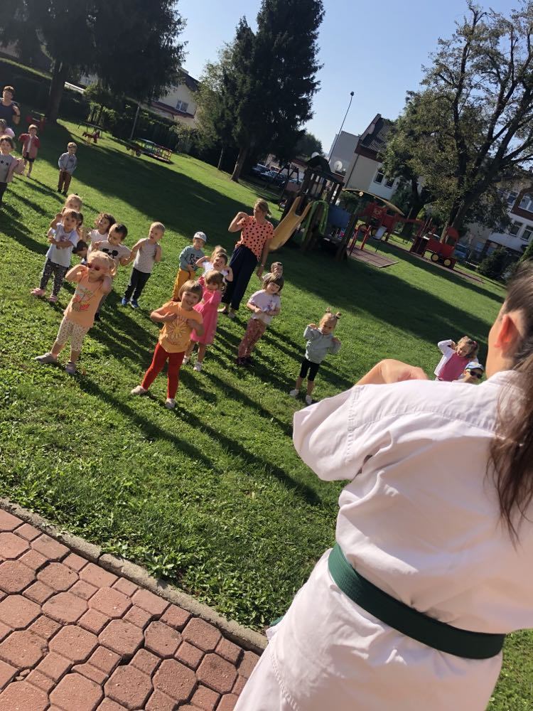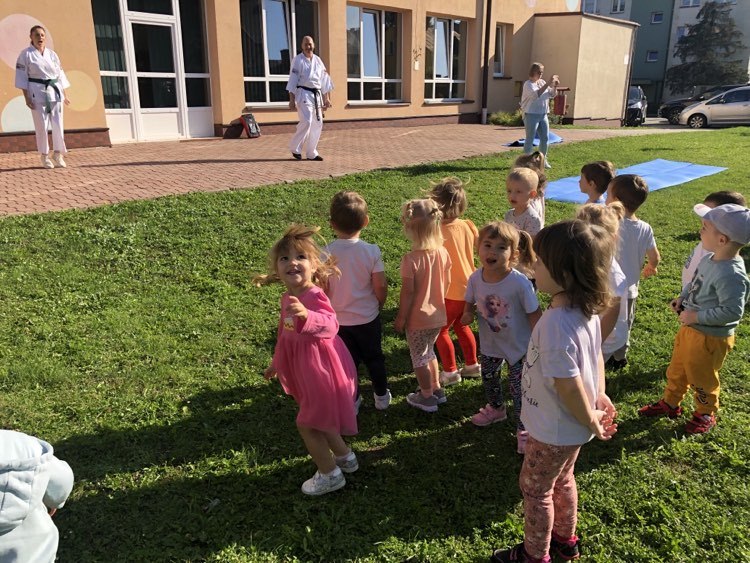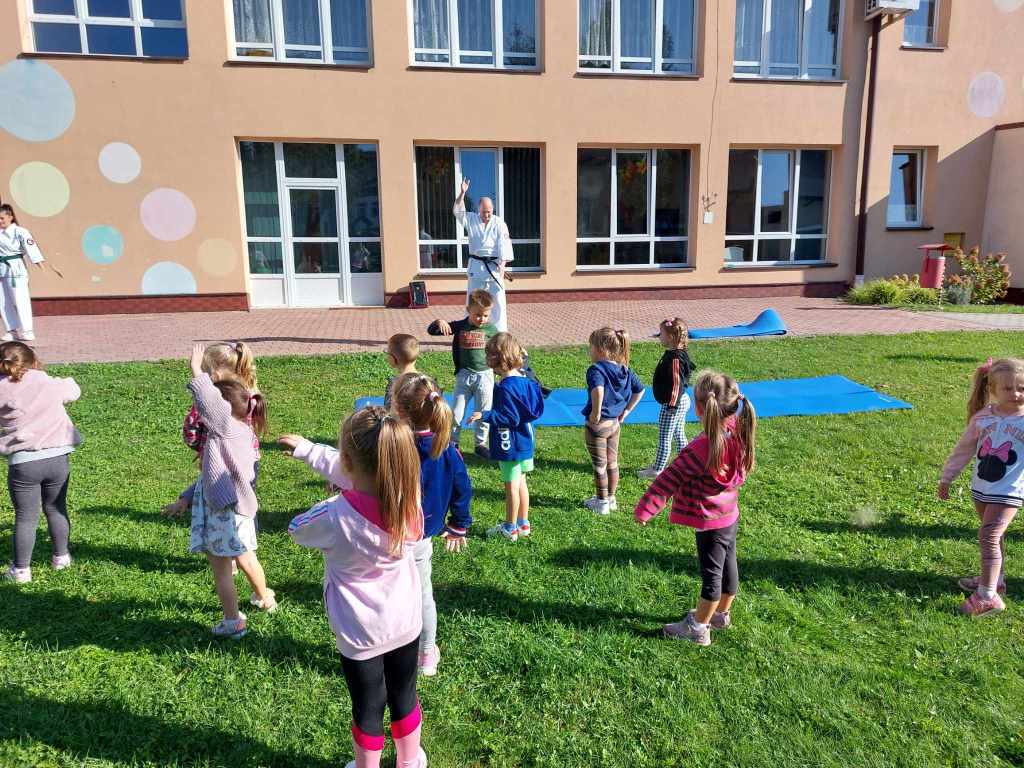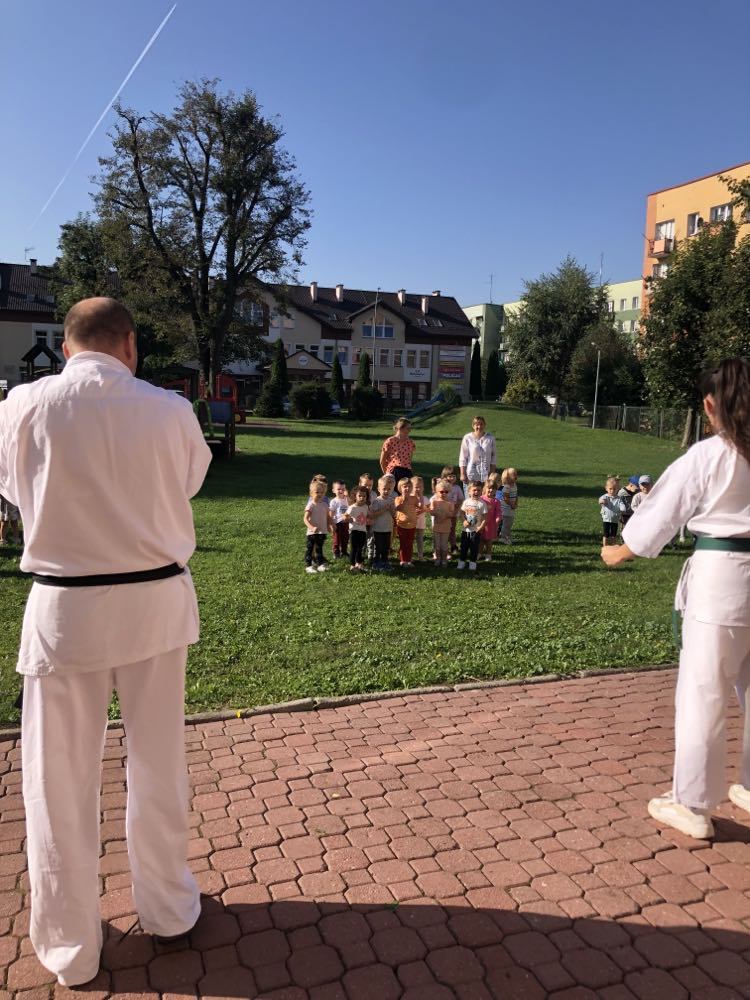 Dnia 28 września w naszym przedszkolu gościliśmy przedstawicieli z UKS Karate Kyokushin „Byakko”. Wizytę rozpoczęła krótka pogadanka na temat sztuk walki oraz zaprezentowanie charakterystycznego stroju. Wszystkie przedszkolaki miały możliwość zobaczenia podstawowych pozycji oraz okrzyków, a także uczestniczyć w krótkim treningu. Na pewno wszystkie dzieci zapamiętają to spotkanie na długo.