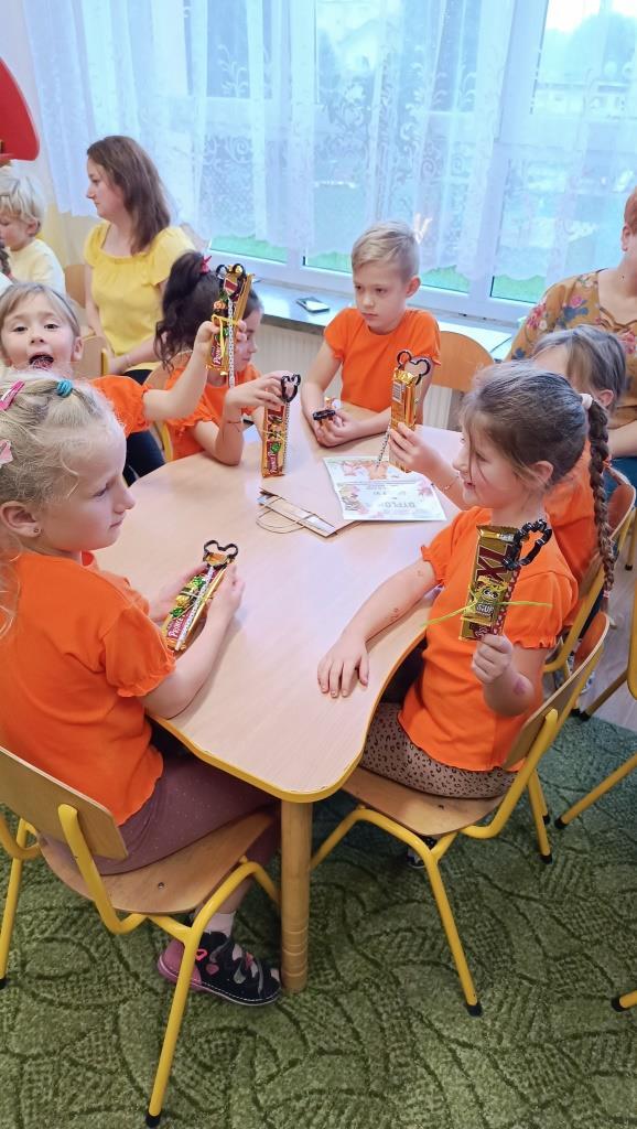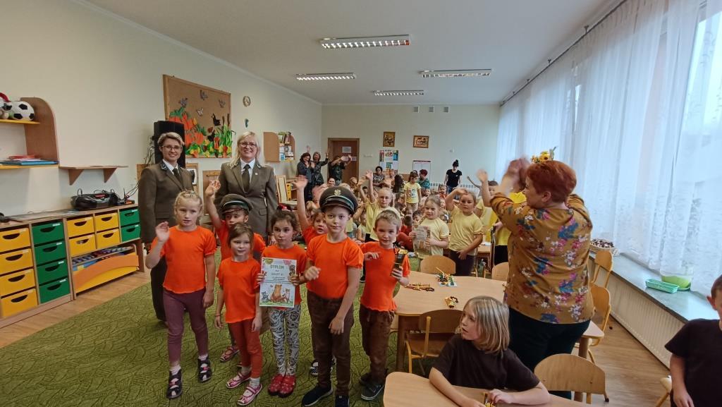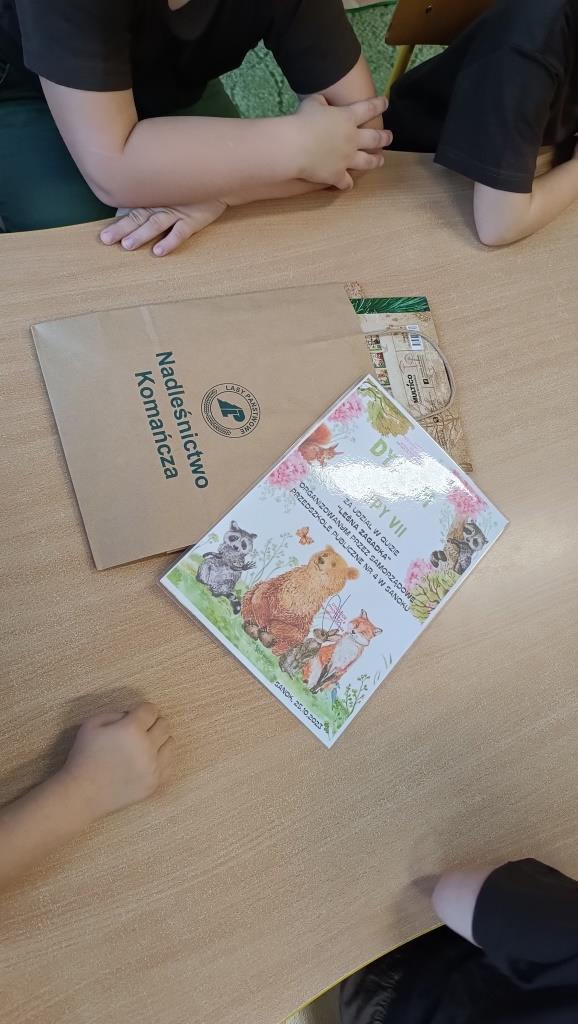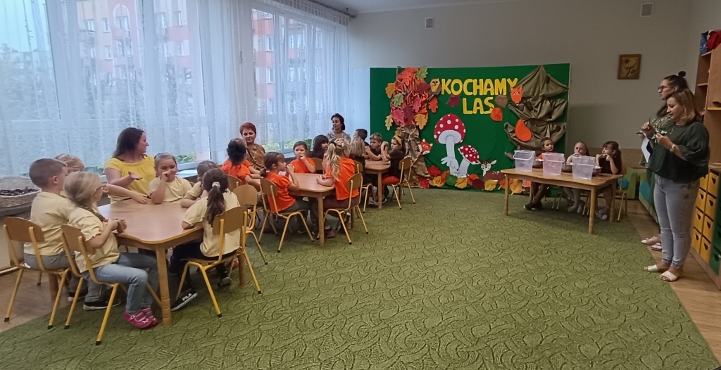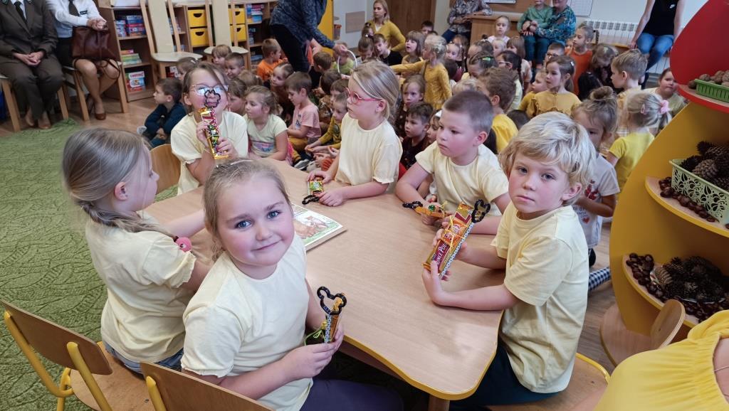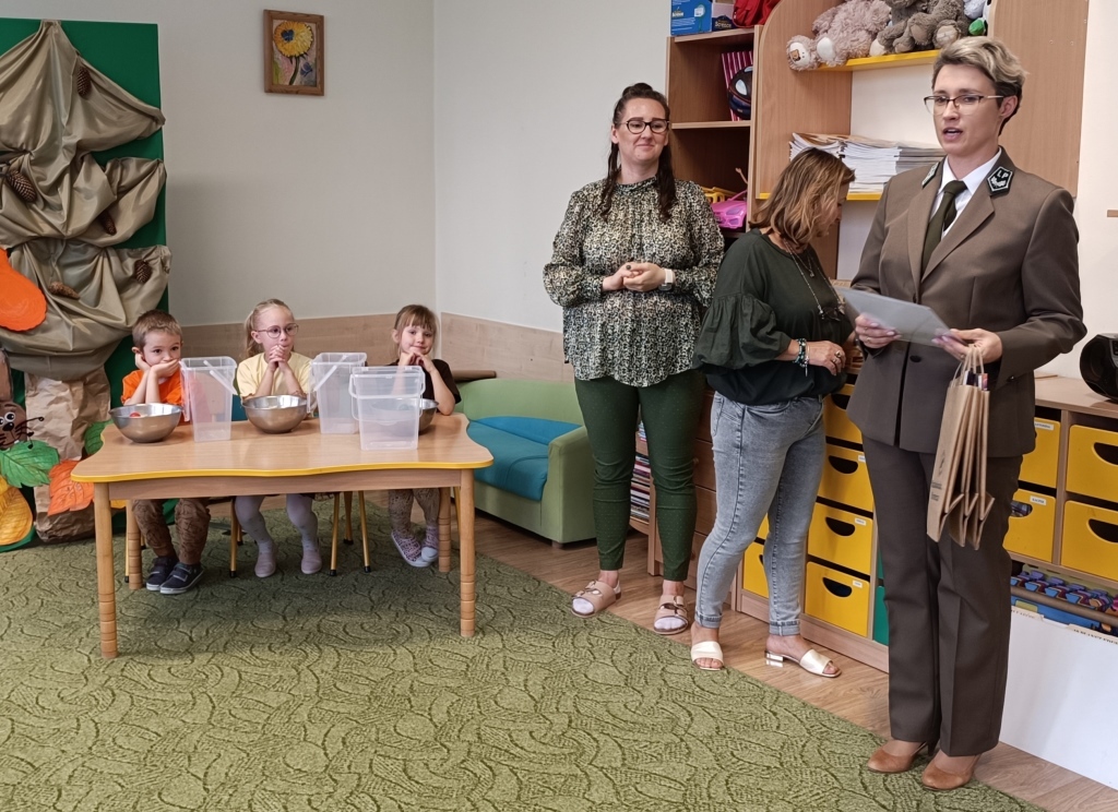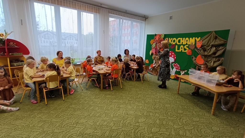 Dnia 25.10. 2023r. grupy starsze odwiedziły Panie Leśnik z Nadleśnictwa Komańcza. Goście Pani Katarzyna A. i Pani Karolina S. uczestniczyły w spotkaniu z dziećmi z grupy V, VI, VII, VIII i IX. Starszaki wzięły udział w quizie „Jesienne zagadki”. Wszystkie 7-mio osobowe 3 drużyny rozwiązywały różne zadania. W czasie wykonywania przez zawodników poleceń, widzowie śpiewali wesołe piosenki o tematyce jesiennej, dopingując drużyny do pracy. Nad poprawnością zadań czuwało jury w składzie naszych gości i Dyrekcji przedszkola. Przedstawiciele grup skrupulatnie wkładali punkty za poprawne odpowiedzi. Wszystkie drużyny zdobyły tyle samo punktów, za super wykonane zadania. Następnie Pani Karolina opowiedziała dzieciom o swojej pracy, o lesie i mieszkających w nim zwierzętach w barwny i interesujący sposób. Przedszkolaki miały okazję poznać zwyczaje niektórych zwierząt – wiewiórki, niedźwiedzia, sójki, a także sposoby pomagania zwierzętom na przetrwanie zimy. Dzieci dowiedziały się również, jak trzeba zachowywać się lesie, żeby uniknąć spotkania z niedźwiedziem. Spotkanie przebiegło w miłej i radosnej atmosferze. Dzieci wykazały się dużą wiedzą. W podziękowaniu otrzymały od gości książeczki i drobne upominki oraz budkę dla ptaków, a od Pań Dyrektorek nagrody, a widzowie cukierki.