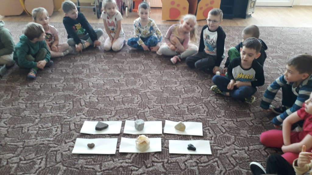 W Grupie 4 odbyły się wyjątkowe zajęcia matematyczne, które przeniosły dzieci w fascynujący świat geologii i górnictwa. Tematem przewodnim zajęć były skały – ich rodzaje, pochodzenie oraz zastosowanie. Dzieci poznały klasyfikację skał na pierwotne, osadowe i metamorficzne, a także mogły z bliska przyjrzeć się eksponatom kamieni pochodzących z różnych zakątków Polski i świata.