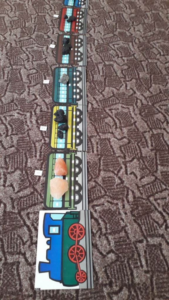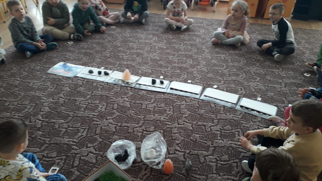 Szczególnym zainteresowaniem cieszyły się gatunki soli kamiennej oraz węgla kamiennego. Dzieci dowiedziały się, skąd są wydobywane te surowce i jaką rolę odgrywają w codziennym życiu. Wiedza teoretyczna została wzbogacona o aktywności praktyczne – przedszkolaki układały „wagony”, które symbolizowały górnicze transporty, i umieszczały w nich określoną liczbę kawałków soli lub węgla. Na podstawie poleceń nauczyciela dzieci dodawały lub odejmowały elementy, porównywały ilości, a także uczyły się pojęć związanych z powiększaniem i pomniejszaniem zbiorów. Zajęcia miały również charakter zabawowy – dzieci wzięły udział w grze edukacyjnej, podczas której same wcielały się w rolę wagoników kopalnianych. Na sygnał nauczyciela ustawiały się w odpowiedniej kolejności, ucząc się przy tym współpracy i logicznego myślenia.