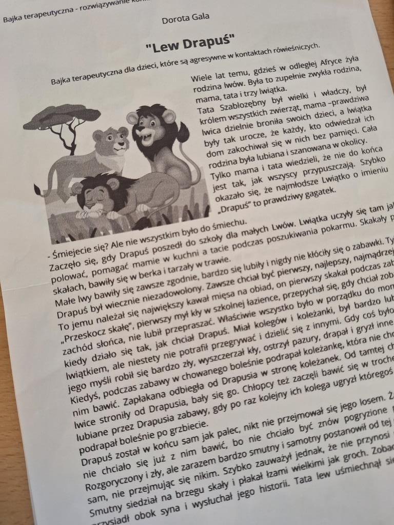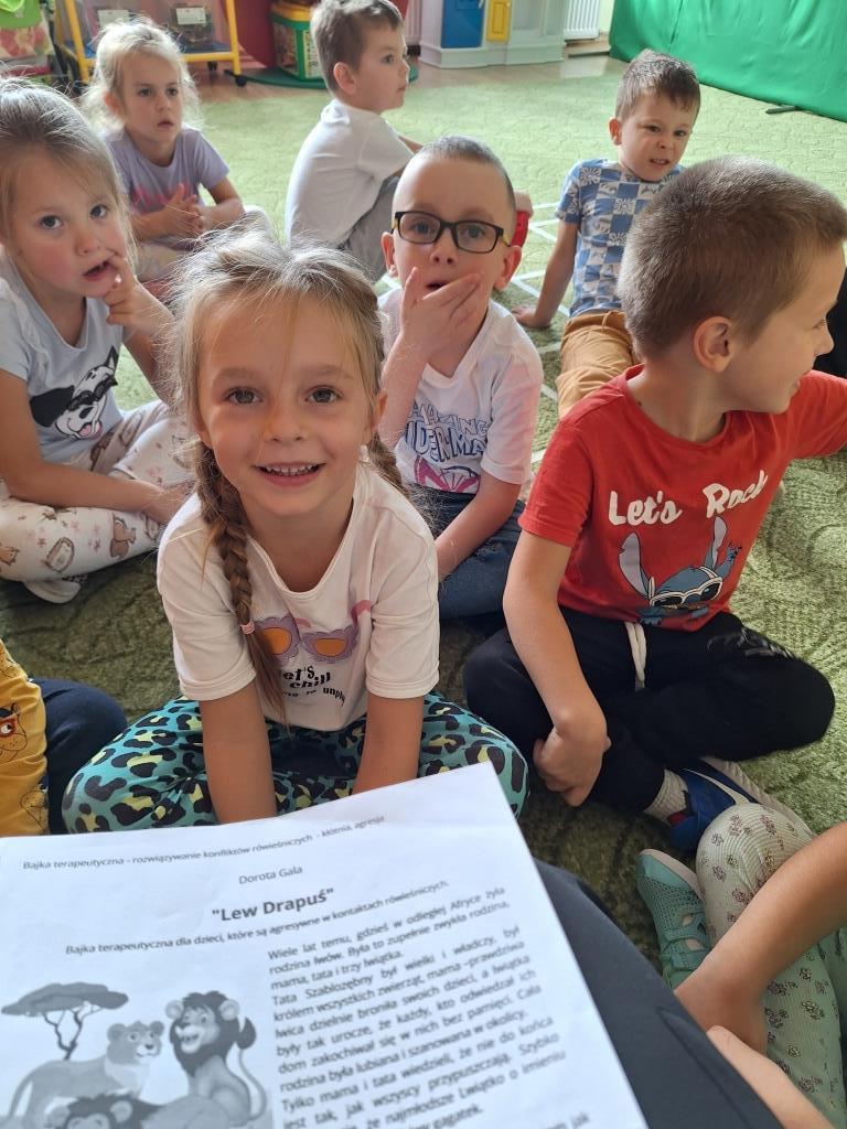 Dnia 28 października dzieci z grupy V poznały bajkę terapeutyczną pt. „Lew Drapuś” w ramach projektu edukacyjnego Bajki- pomagajki. Dzieci dowiedziały się, że trzeba być grzecznym, bawić się zgodnie z kolegami, koleżankami i nikomu nie robić krzywdy.