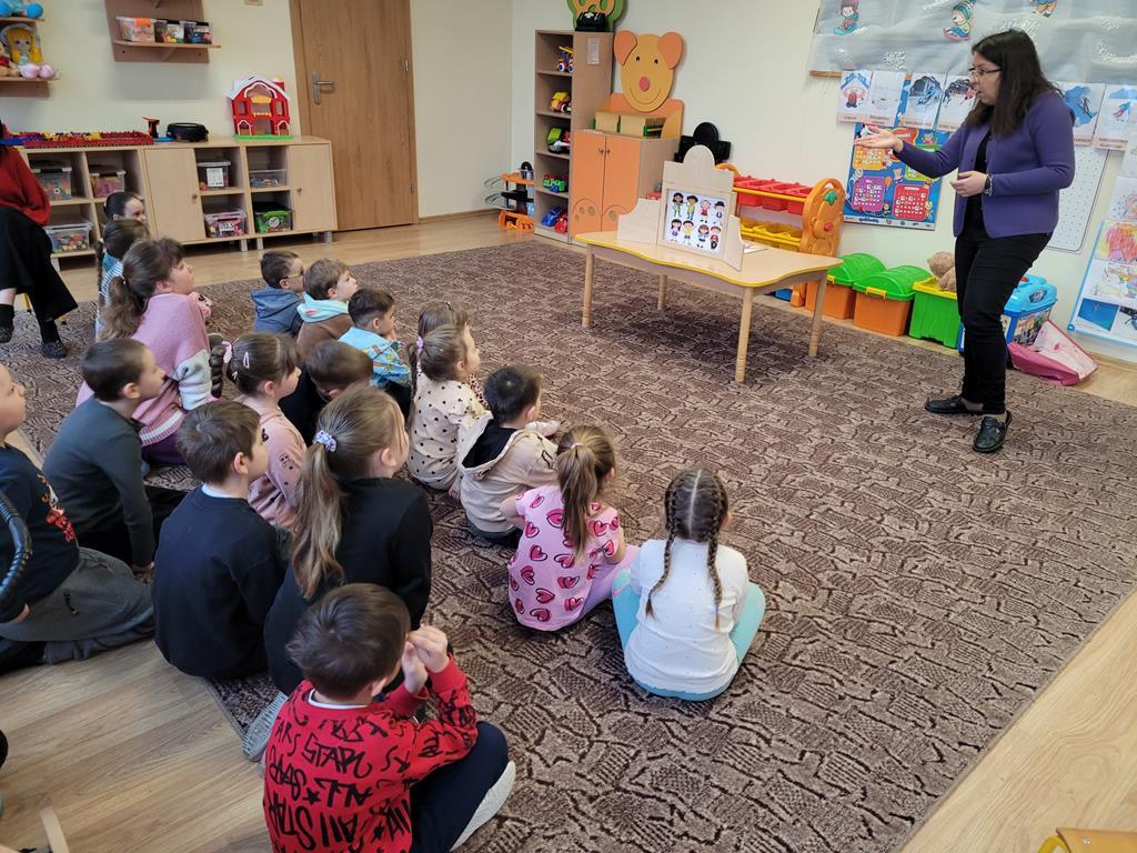 W dniu 24.02.2025r. dzieci z grupy V, VI, VII i VIII uczestniczyły w spotkaniu z p. bibliotekarką z MBP- filia Posada, w ramach tygodnia zajęć o bajkach i baśniach. Pani Marzenka zaprezentowała dzieciom japoński teatr papierowy „Kamishibai”. Drewniana scena z opowieścią na papierze w środku skupiała uwagę dzieci i przekonywała, że tolerancja jest czymś niezwykle istotnym w życiu człowieka. Prezentowane ilustracje poruszały ważne kwestie społeczne i zachęcały dzieci do bycia człowiekiem tolerancyjnym, wyrozumiałym, empatycznym wobec innych ludzi z deficytami. Dziękujemy p. Marzence za tą wartościową lekcję i spotkanie. Do zobaczenia ponownie!