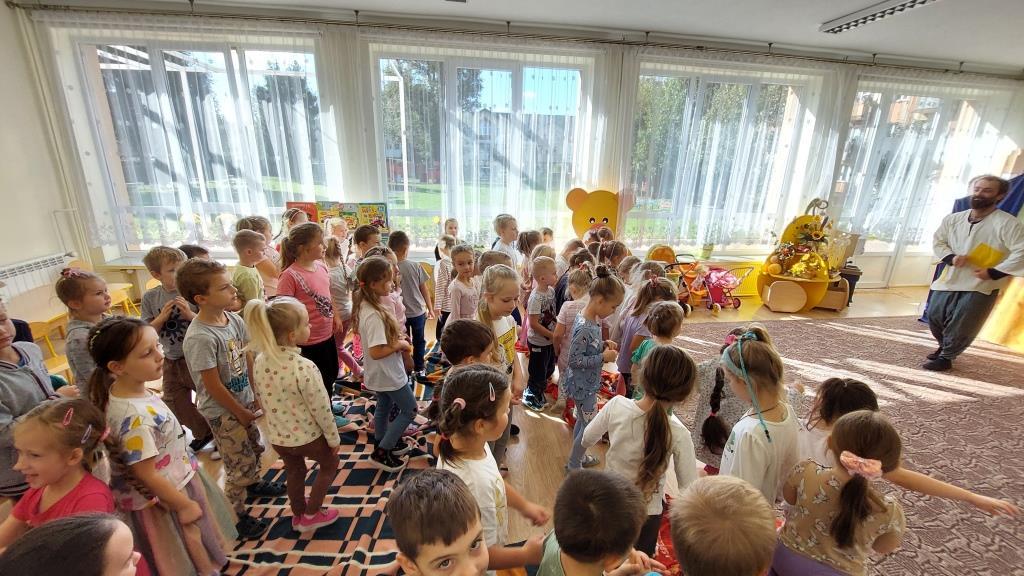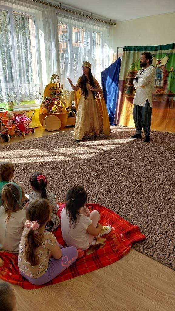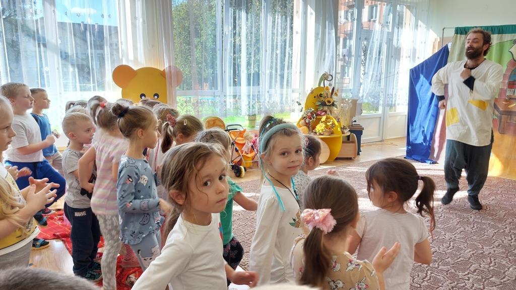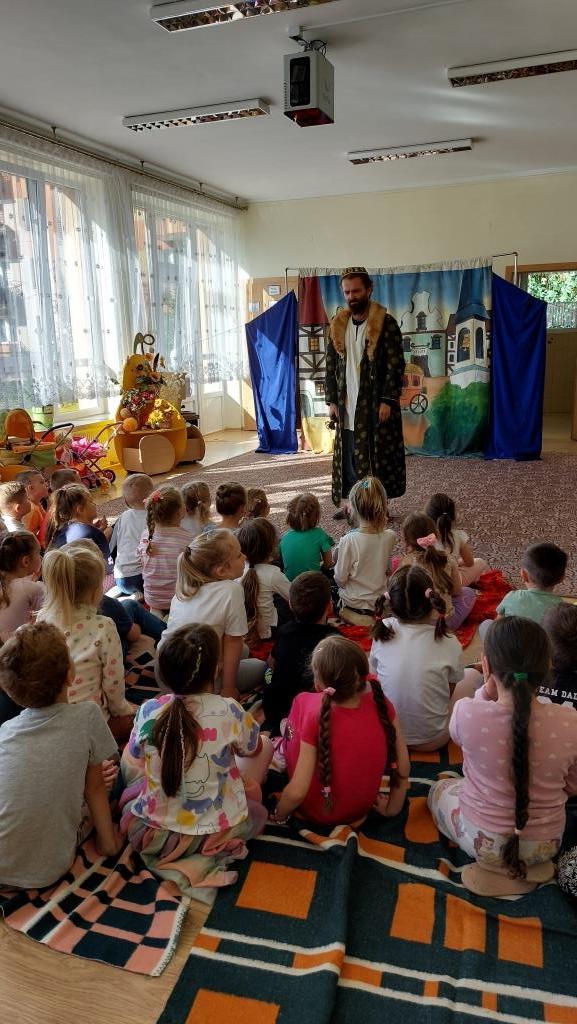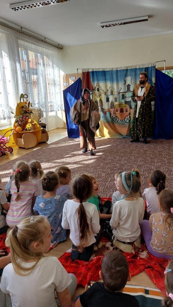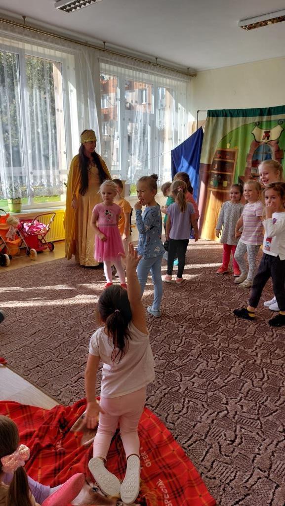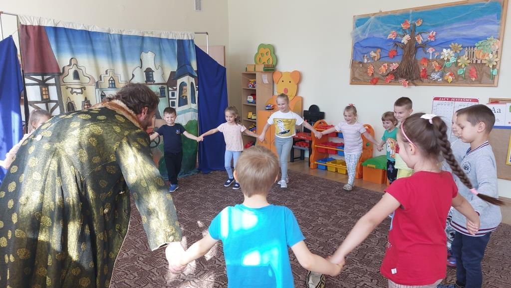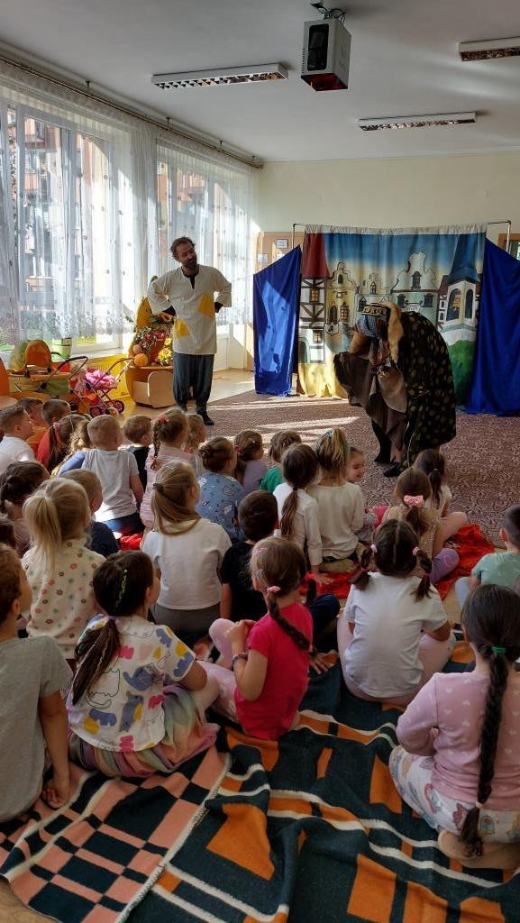 We czwartek 10 października nasze przedszkole odwiedził teatr żywego aktora z Krakowa „Krak-art”. Dzieci ze wszystkich grup przedszkolnych obejrzały przedstawienie w inscenizacji znanej bajki pt. „Złota Kaczka”. Bajka treścią nawiązywała do starej, znanej krakowskiej legendy. Przedszkolaki z dużym zaciekawieniem obejrzały spektakl, w którym również uczestniczyły tańcząc, klaskając i odgadując następujące po sobie sceny. Pomagały przywoływać postacie oraz zapytane, podpowiadały co należy zrobić w zaistniałej sytuacji. Bajka zakończyła się szczęśliwie a dzieci utrwaliły sobie zasadę, że dobrze jest dzielić się z innymi, a także warto być dla siebie uprzejmym. Inscenizacja bajki sprawiła dzieciom wiele radości i wywołała uśmiech na niejednej twarzy.