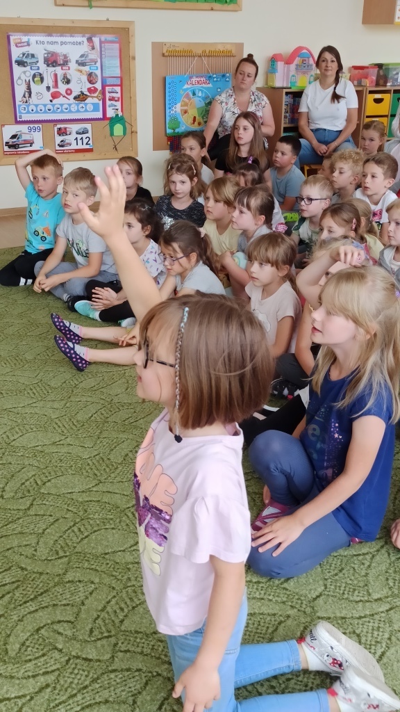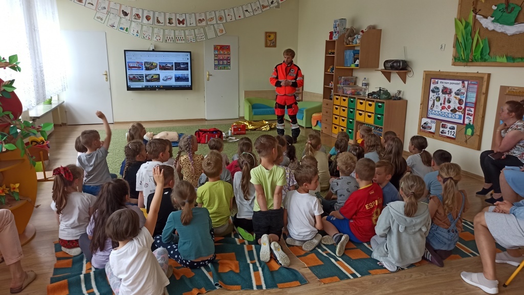 Ratownik przypomniał dzieciom o zachowaniu bezpieczeństwa podczas wakacji – w czasie kąpieli wodnych i słonecznych oraz podczas jazdy rowerem lub hulajnogą. Wyjaśnił jak należy zachować się w przypadku użądlenia lub ukąszenia (np. przez kleszcza).