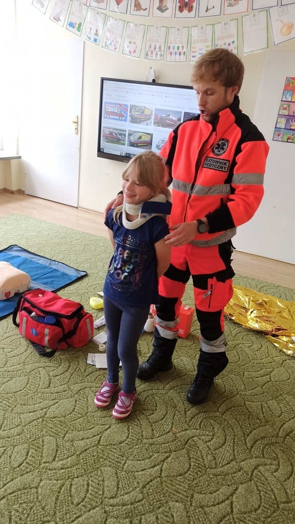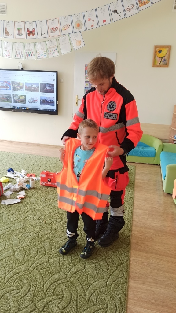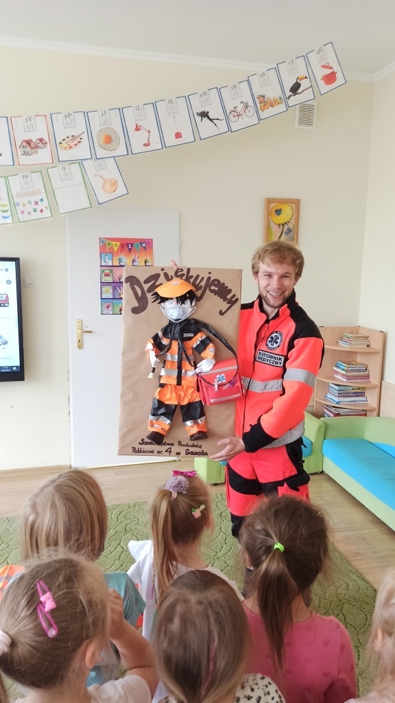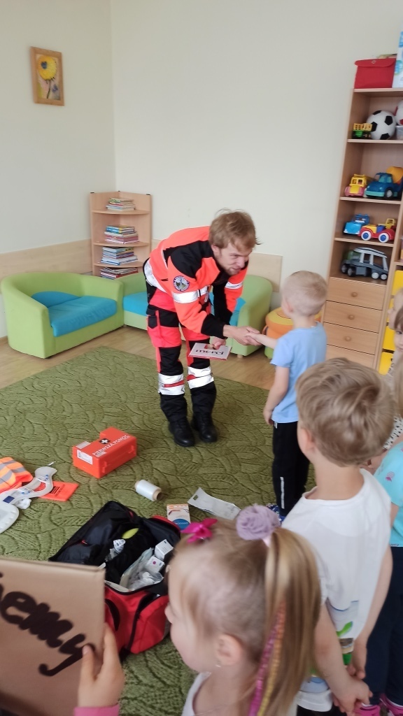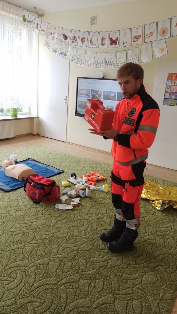 Na samym początku Pan Michał pokazał dzieciom jak wygląda strój, w którym pracuje na co dzień. Wyjaśnił na czym polega jego praca oraz pokazał co znajduje się w torbie ratownika i co powinno znaleźć się w apteczce samochodowej. Dzieci utrwaliły sobie także numery alarmowe.