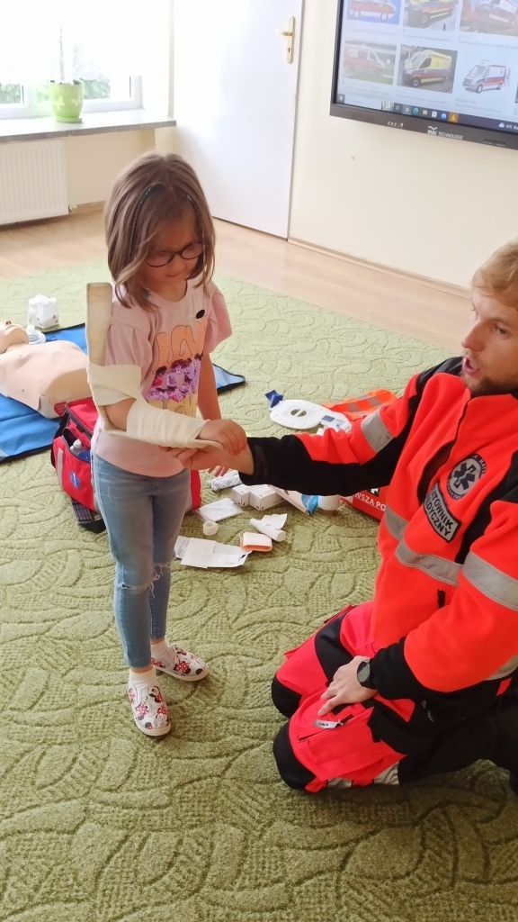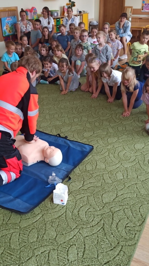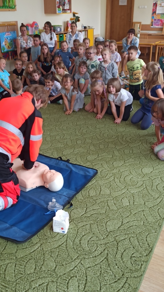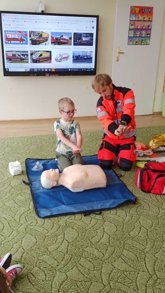 Pan Michał przedstawił także zasady udzielania pierwszej pomocy. Pokazał jak należy sprawdzić przytomność osoby poszkodowanej, w jaki sposób wezwać pomoc oraz jak wykonać masaż serca. Przedszkolaki z wielkim zaangażowaniem naśladowały czynności pokazywane przez ratownika dotyczące udzielania pierwszej pomocy. Same mogły spróbować swoich sił w ćwiczeniach udzielania pierwszej pomocy na fantomie.