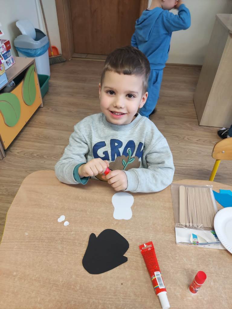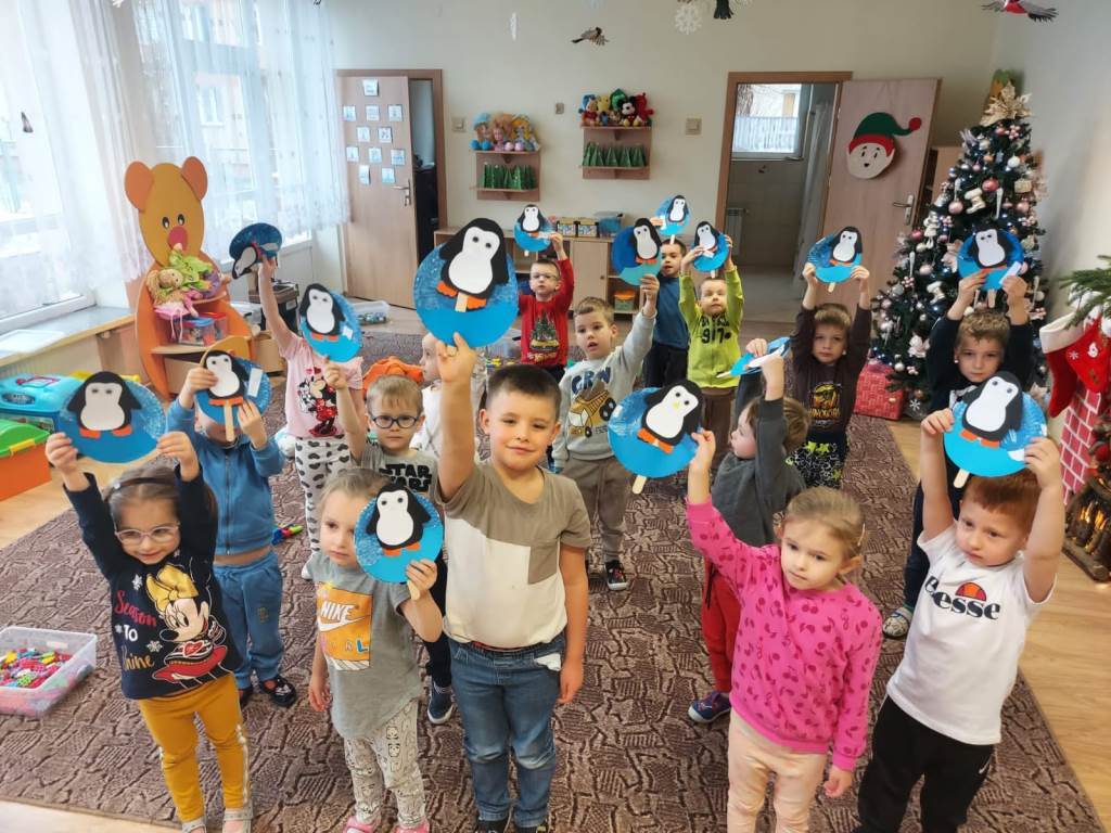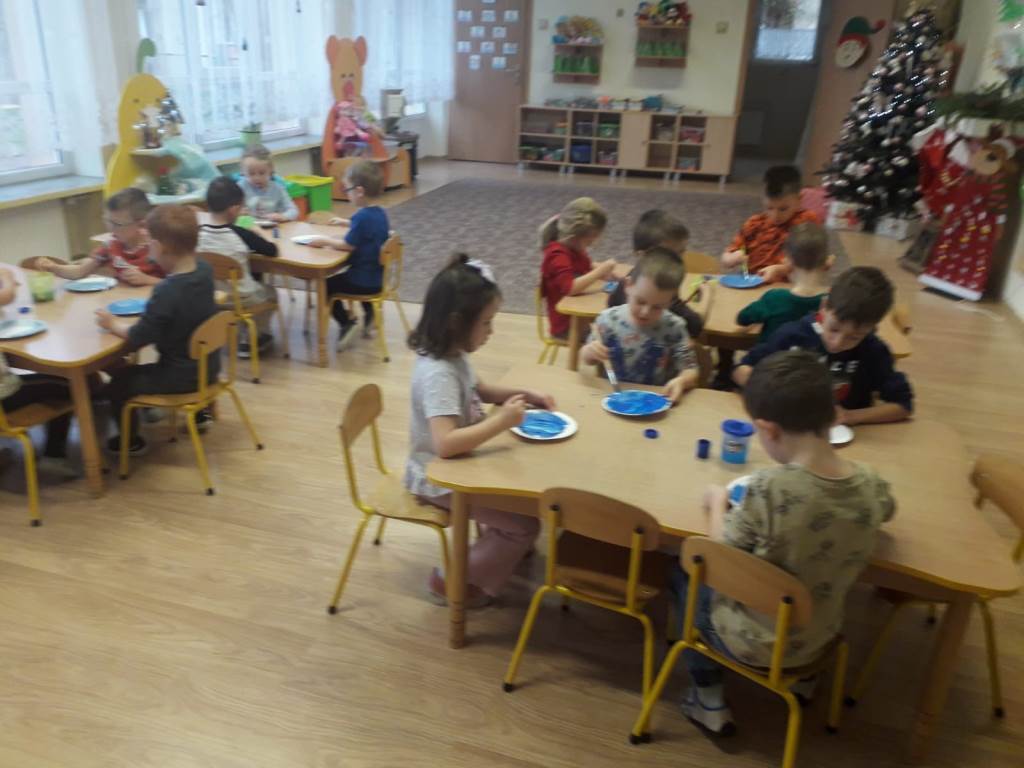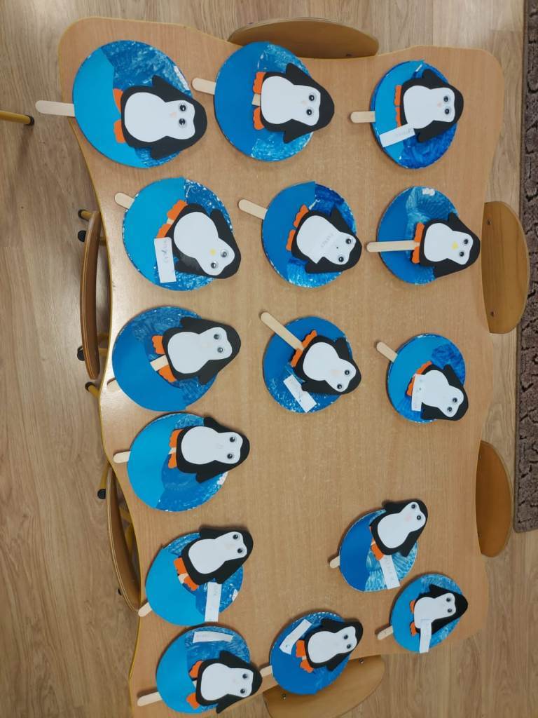 W grupie 4 odbyły się kreatywne zajęcia matematyczno-ruchowe, które połączyły naukę z zabawą. Dzieci segregowały cyfry, tworzyły zbiory i rozwiązywały zadania z chmurkami oraz śnieżynkami, ucząc się liczenia i porównywania ilości. Na tablicy magnetycznej rysowały tyle kulek, ile wskazywała wylosowana cyfra, co pozwalało im ćwiczyć koordynację i precyzję. W zabawie ruchowej dzieci przemieszczały się w grupach, dostosowując ich liczebność do wylosowanej cyfry, co dodatkowo rozwijało umiejętności współpracy. Na zakończenie wykonały pracę plastyczną „Pingwin na krze” – malowały talerzyk, składały elementy i kolorowały szczegóły, tworząc piękne zimowe kompozycje. Zajęcia przebiegły w atmosferze radości i zaangażowania.