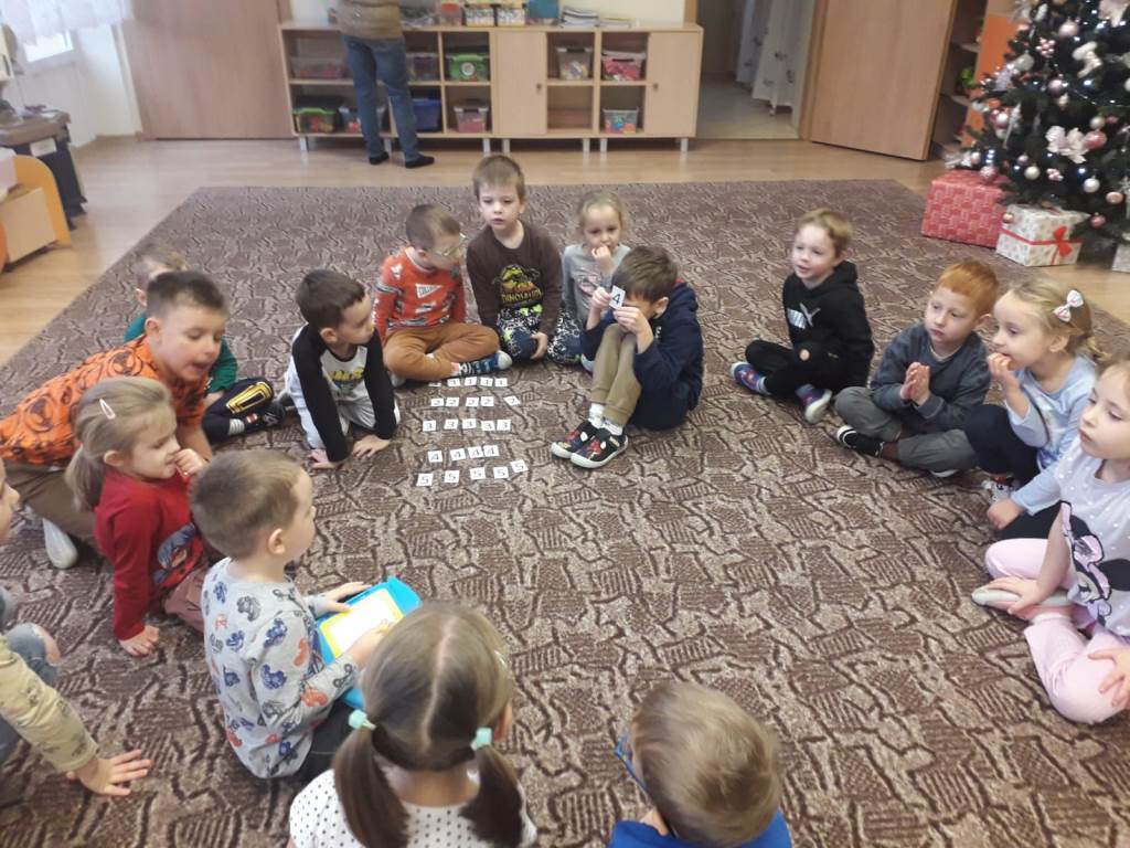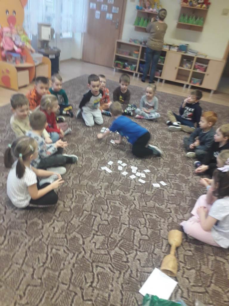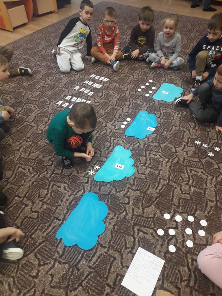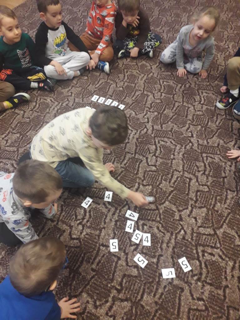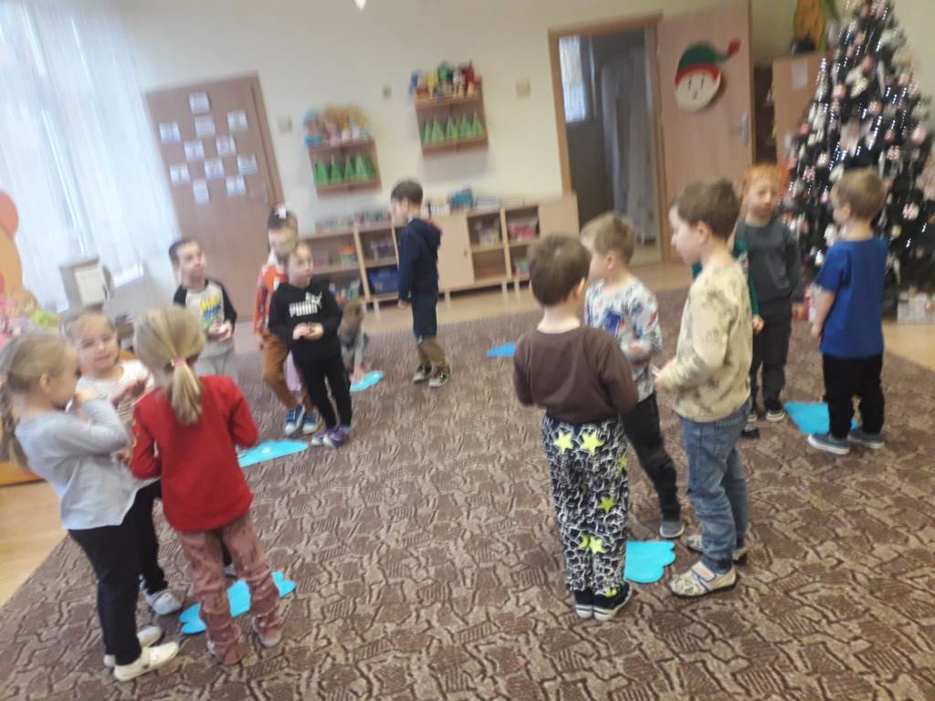 W grupie 4 odbyły się kreatywne zajęcia matematyczno-ruchowe, które połączyły naukę z zabawą. Dzieci segregowały cyfry, tworzyły zbiory i rozwiązywały zadania z chmurkami oraz śnieżynkami, ucząc się liczenia i porównywania ilości. Na tablicy magnetycznej rysowały tyle kulek, ile wskazywała wylosowana cyfra, co pozwalało im ćwiczyć koordynację i precyzję. W zabawie ruchowej dzieci przemieszczały się w grupach, dostosowując ich liczebność do wylosowanej cyfry, co dodatkowo rozwijało umiejętności współpracy. Na zakończenie wykonały pracę plastyczną „Pingwin na krze” – malowały talerzyk, składały elementy i kolorowały szczegóły, tworząc piękne zimowe kompozycje. Zajęcia przebiegły w atmosferze radości i zaangażowania.