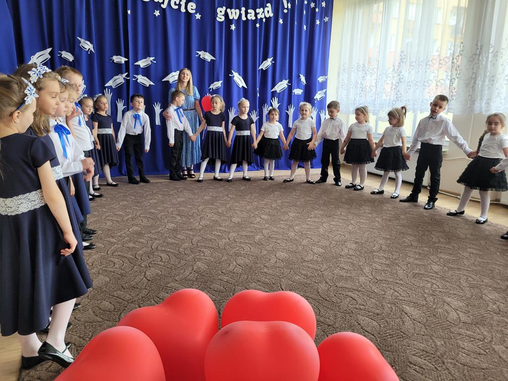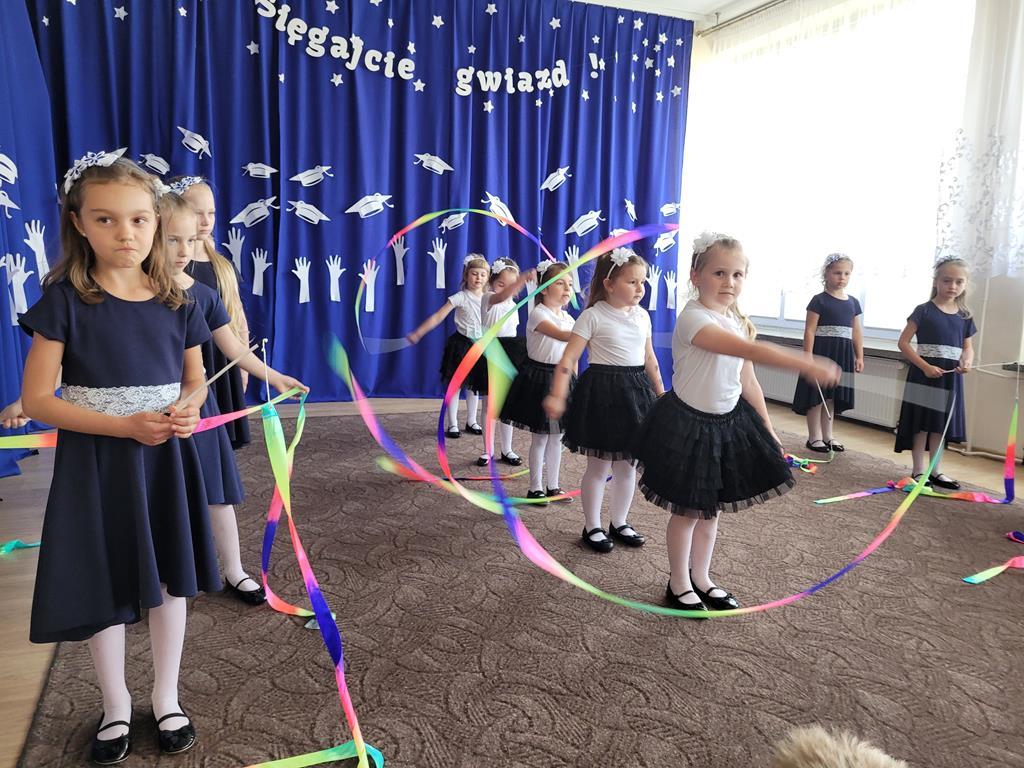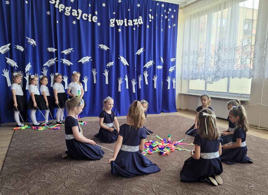 W dniu 13.06.2025r. dzieci z gr. VI uroczyście żegnały się z przedszkolem. Tak niedawno przekroczyły próg przedszkola jako maluszki. Z łezką w oku i niepewnością szły do swoich sal żegnając się z rodzicami, a już dziś kończą przedszkole i wyfruwają do szkoły. Wierszem, tańcem i piosenką żegnały się ze wszystkimi dziękując równocześnie za te wspólne lata. Młodsi koledzy przygotowali dla nich miłą niespodziankę i zaprosili ich do świata nowych przygód. Na zakończenie Pani Dyrektor podziękowała za cały rok pracy, pogratulowała małym aktorom sukcesu i podziękowała Rodzicom za współpracę, wsparcie i zaangażowanie w rozwój placówki. Dzieci otrzymały piękne prezenty i pamiątkowe tabla. Niech pobyt w przedszkolu będzie dla Was drogie dzieci miłym wspomnieniem, a szkoła wyjątkową przygodą. Był to wyjątkowy czas, czas wspólnej pracy i zabawy, nowych doświadczeń, wzlotów i upadków. Dziś silni i mądrzejsi ruszacie w dalszą drogę, ale pamiętajcie, że drzwi do przedszkola są dla Was zawsze otwarte! „Sięgajcie gwiazd!”.