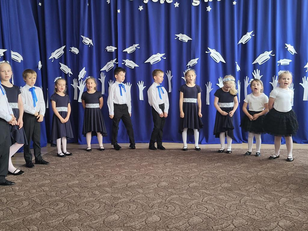 W dniu 13.06.2025r. dzieci z gr. VI uroczyście żegnały się z przedszkolem. Tak niedawno przekroczyły próg przedszkola jako maluszki. Z łezką w oku i niepewnością szły do swoich sal żegnając się z rodzicami, a już dziś kończą przedszkole i wyfruwają do szkoły. Wierszem, tańcem i piosenką żegnały się ze wszystkimi dziękując równocześnie za te wspólne lata. Młodsi koledzy przygotowali dla nich miłą niespodziankę i zaprosili ich do świata nowych przygód. Na zakończenie Pani Dyrektor podziękowała za cały rok pracy, pogratulowała małym aktorom sukcesu i podziękowała Rodzicom za współpracę, wsparcie i zaangażowanie w rozwój placówki. Dzieci otrzymały piękne prezenty i pamiątkowe tabla. Niech pobyt w przedszkolu będzie dla Was drogie dzieci miłym wspomnieniem, a szkoła wyjątkową przygodą. Był to wyjątkowy czas, czas wspólnej pracy i zabawy, nowych doświadczeń, wzlotów i upadków. Dziś silni i mądrzejsi ruszacie w dalszą drogę, ale pamiętajcie, że drzwi do przedszkola są dla Was zawsze otwarte! „Sięgajcie gwiazd!”.